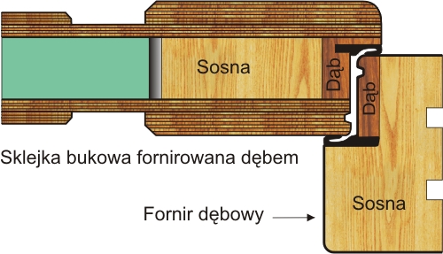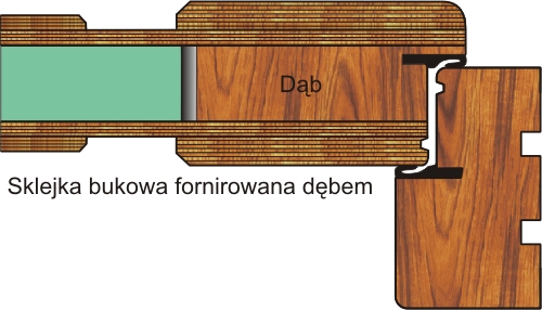 Drzwi o konstrukcji sosnowej wykończone sklejką, dodatkowo wzmacniane płaskownikiem stalowym od strony zamka. Zewnętrzne warstwy dębowe nadają drzwiom indywidualną strukturę i podkreślają rysunek słoja. Boczne elementy dębowe zakrywają sosnową konstrukcje. Szczególnie zalecane w drzwiach o jasnych kolorach, w których może wystąpić duża różnica odcieni między drewnem sosnowym a dębowym.