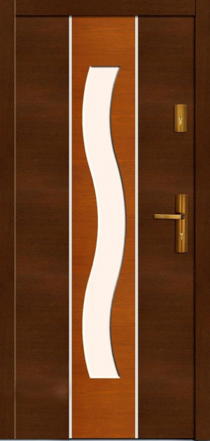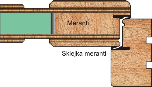 Drzwi o konstrukcji w 100% meranti wykończone sklejką, dodatkowo wzmacniane płaskownikiem stalowym od strony zamka. Zewnętrzne warstwy meranti nadają drzwiom indywidualną strukturę i podkreślają rysunek słoja.