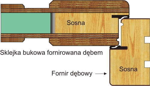 Drzwi o konstrukcji sosnowej wykończone sklejką, dodatkowo wzmacniane płaskownikiem stalowym od strony zamka. Zewnętrzne warstwy dębowe nadają drzwiom indywidualną strukturę i podkreślają rysunek słoja. Elementy sosnowe są widoczne tylko po otwarciu drzwi i z czoła skrzydła.
